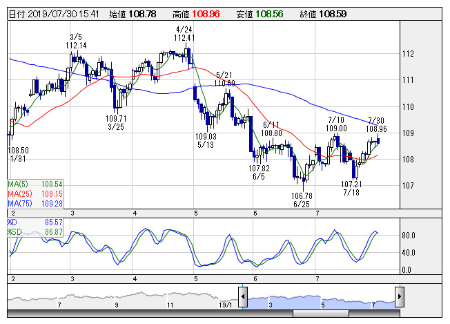 2019年07月30日16時01分 【通貨】外為:1ドル108円61銭前後と横ばい圏で推移 米ドル/円 <日足> Slowストキャス 「株探」多機能チャートより 30日の外国為替市場のドル円相場は午後4時時点で1ドル=108円61銭前後と、前日午後5時時点に比べ3銭のドル安・円高と横ばい圏。ユーロ円は1ユーロ=120円94銭前後と15銭のユーロ高・円安で推移している。 株探ニュース