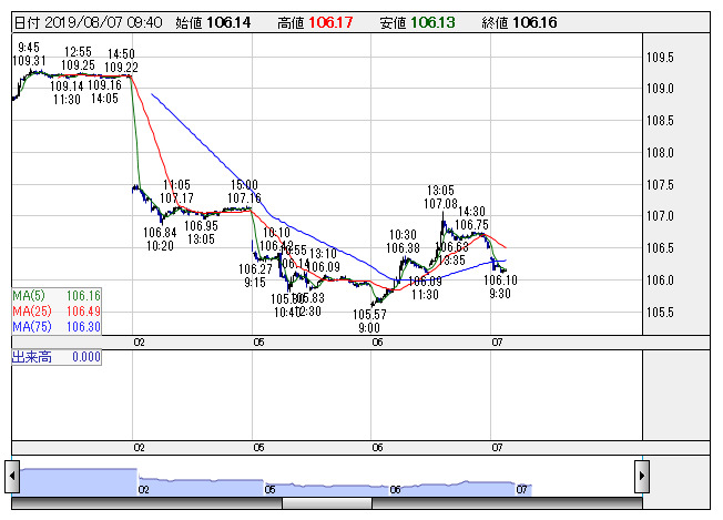 2019年08月07日10時01分 【通貨】外為:1ドル106円26銭前後と小幅なドル安・円高で推移 米ドル/円 <5分足> 「株探」多機能チャートより 7日の外国為替市場のドル円相場は午前10時時点で1ドル=106円26銭前後と、前日午後5時時点に比べ9銭の小幅なドル安・円高。ユーロ円は1ユーロ=119円08銭前後と15銭のユーロ安・円高で推移している。 株探ニュース