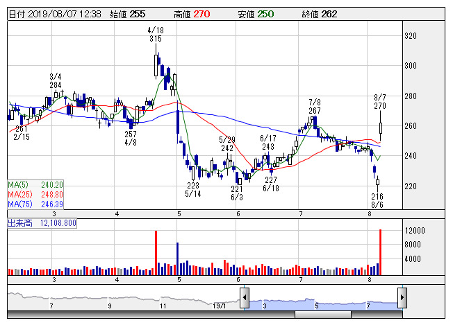 JVCケンウ <日足> 「株探」多機能チャートよりJVCケンウッドに物色人気集中。前場に20%高の270円に急騰する場面があった。同社が7日取引終了後に発表した19年4~6月期決算は営業利益が前年同期比78%増の17億7100万円と急拡大、これを手掛かり材料に投資資金が流入した。ドライブレコーダーの販売が好調だったほか、国内無線システムなどの販売が伸びて全体収益を押し上げている。株価は前日時点で年初来安値をつけていただけに値ごろ感が働いた。