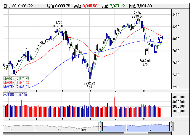 NASDAQ <日足> 「株探」多機能チャートより米国株式相場はまちまち。ダウ平均は49.51ドル高の26252.24、ナスダックは28.82ポイント安の7991.39で取引を終了した。堅調なドイツ・フランスの製造業PMIや米小売決算が好感され買いが先行したものの、8月マークイット製造業PMIが節目となる50を下回ったことを受けて株式相場も下落。その後は多くの連銀高官から利下げに否定的な見解が相次ぎ米長期金利が反発したのに伴い、株式相場も下げ幅を縮小したものの、明日のパウエルFRB議長の講演を見極めたいとの思惑から小動きとなった。セクター別では、銀行や食品・生活必需品小売が上昇する一方でヘルスケア機器・サービスや素材が下落した。