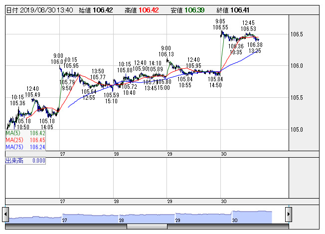 2019年08月30日14時01分 【通貨】外為:1ドル106円38銭前後とドル高・円安で推移 米ドル/円 <5分足> 「株探」多機能チャートより 30日の外国為替市場のドル円相場は午後2時時点で1ドル=106円38銭前後と、前日午後5時時点に比べ28銭のドル高・円安。ユーロ円は1ユーロ=117円50銭前後と5銭の小幅なユーロ安・円高で推移している。 株探ニュース