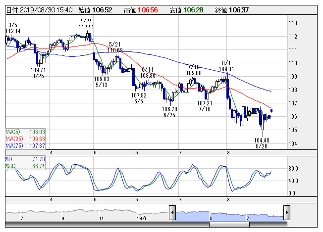 2019年08月30日16時01分 【通貨】外為:1ドル106円37銭前後とドル高・円安で推移 米ドル/円 <日足> Slowストキャス 「株探」多機能チャートより 30日の外国為替市場のドル円相場は午後4時時点で1ドル=106円37銭前後と、前日午後5時時点に比べ27銭のドル高・円安。ユーロ円は1ユーロ=117円42銭前後と13銭のユーロ安・円高で推移している。 株探ニュース