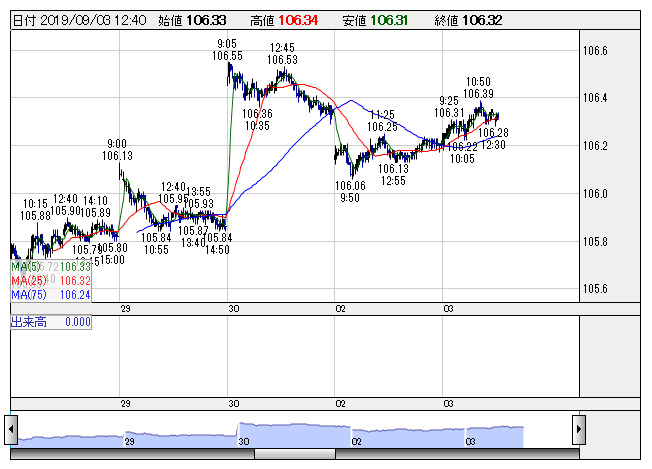 2019年09月03日13時01分 【通貨】外為:1ドル106円30銭前後と小幅なドル高・円安で推移 米ドル/円 <5分足> 「株探」多機能チャートより 3日の外国為替市場のドル円相場は午後1時時点で1ドル=106円30銭前後と、前日午後5時時点に比べ5銭の小幅なドル高・円安。ユーロ円は1ユーロ=116円23銭前後と43銭のユーロ安・円高で推移している。 株探ニュース