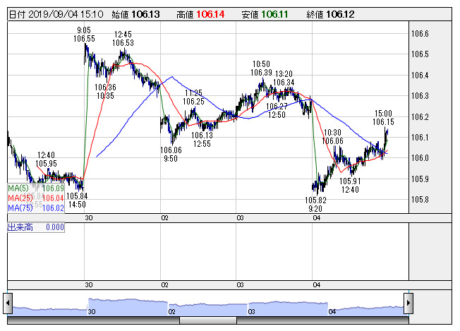 2019年09月05日09時01分 【通貨】外為:1ドル106円33銭前後とドル高・円安で推移 米ドル/円 <5分足> 「株探」多機能チャートより 5日の外国為替市場のドル円相場は午前9時時点で1ドル=106円33銭前後と、前日午後5時時点に比べ10銭のドル高・円安。ユーロ円は1ユーロ=117円29銭前後と58銭の大幅なユーロ高・円安で推移している。 株探ニュース