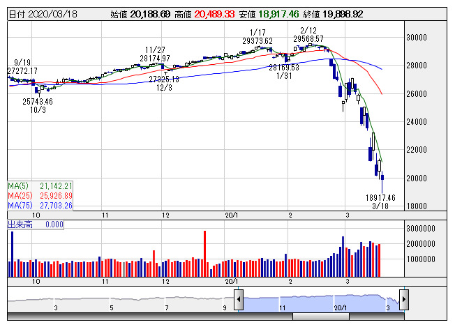 NYダウ <日足> 「株探」多機能チャートより■NY株式:NYダウ1338ドル安、全米50州で新型ウイルスの感染確認