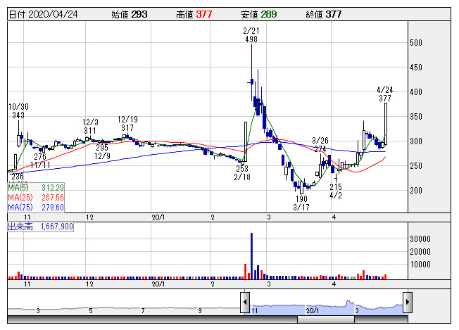 有機薬 <日足> 「株探」多機能チャートより(東証上場 3962 銘柄対象[ETF、REIT含む])
