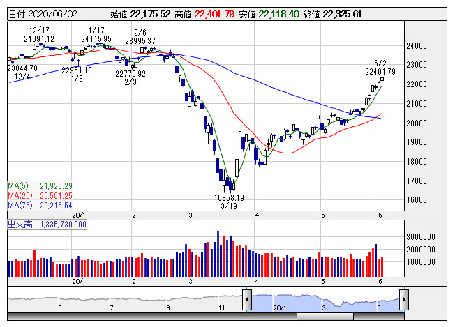 日経平均 <日足> 「株探」多機能チャートより日本取引所が公表した先物手口情報によると、6月2日の日経225ミニ期近(2020年6月限)の夜間取引(立会内・J-NETの合算)で、買い越しトップはABNアムロクリアの6644枚、売り越しトップはソシエテ・ジェネラルの5765枚だった。