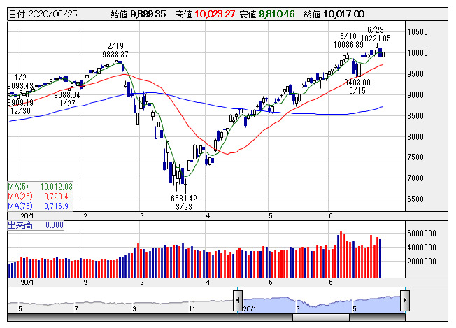 NASDAQ <日足> 「株探」多機能チャートより米国株式相場は反発。ダウ平均は299.66ドル高の25745.60ドル、ナスダックは107.84ポイント高の10017.00ポイントで取引を終了した。連日、ウイルス感染者数の急増が報告されていることを嫌気して下落で寄り付いた。テキサス州知事がヒューストンを含むハリス郡ほか4郡で緊急性のない手術を延期する指示を出したほか、経済活動の段階的な再開をいったん停止すると発表すると下げ幅を拡大した。その後、当局がボルカールールの緩和を承認、スワップ取引の証拠金要件撤廃を発表すると金融関連株中心に上昇に転じ、引けにかけて上げ幅を拡大する展開となった。セクター別では、銀行や保険、各種金融が大きく上昇した一方で、公益事業が下落した。