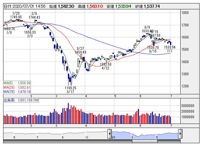 2020年07月01日15時17分 【市況】TOPIX先物:1日清算値=21ポイント安、1537ポイント TOPIX <日足> 「株探」多機能チャートより 1日15時15分、TOPIX先物期近2020年9月限は前日清算値比21ポイント安の1537ポイントで取引を終えた。出来高は7万4602枚だった。この日のTOPIXの現物終値1538.61ポイントに対しては1.61ポイント安。 株探ニュース