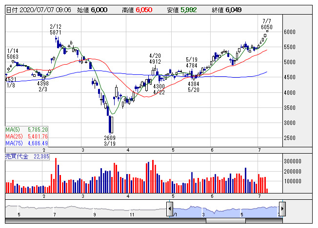 9984>は東証1部で群を抜く売買代金をこなし6連騰、株式分割後修正値で1年2カ月ぶりに6000円大台を回復した。新型コロナウイルスの世界的な感染拡大で同社のビジョン・ファンドを通じて出資した企業の投資価値減少が業績に多大な影響を与えたが、米通信大手TモバイルUS株の一部売却などで資金を調達し、マーケットの過度な不安は後退している。一方、直近では同社が出資する米保険スタートアップのレモネードが株式公開後にセカンダリーで急騰しており、これがソフトバンクGの株価にもポジティブ材料として作用している。
