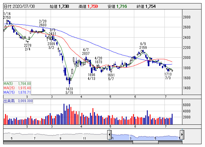 ファミマ <日足> 「株探」多機能チャートより(東証上場 3961 銘柄対象[ETF、REIT含む])