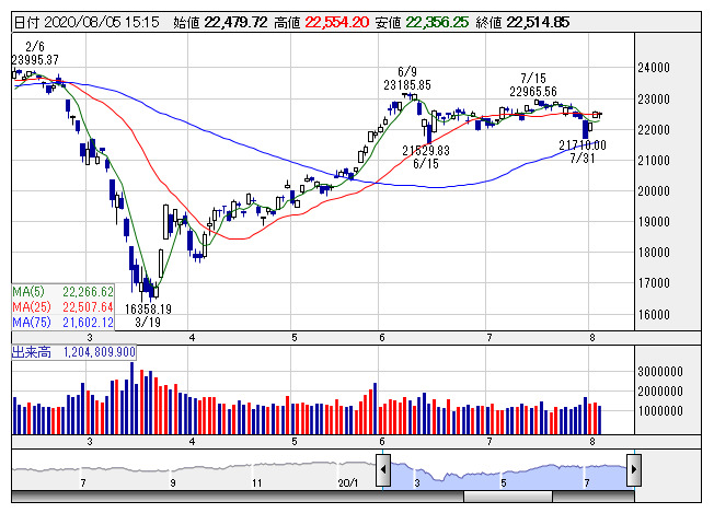 日経平均 <日足> 「株探」多機能チャートより日経平均は3日ぶり反落。4日の米国市場では追加経済対策への期待が高まり、NYダウは164ドル高と3日続伸した。ただ、日経平均は前日までの2日間で860円あまり上昇しており、本日は利益確定売り優勢で93円安からスタート。前場は22400円を挟んでもみ合う展開となり、22356.25円(前日比217.41円安)まで下落する場面もあった。後場に入ると日銀による上場投資信託(ETF)買い入れ実施の思惑から下げ渋ったが、主要企業の4-6月期決算発表が続くことから、積極的に上値を追う動きは限られた。