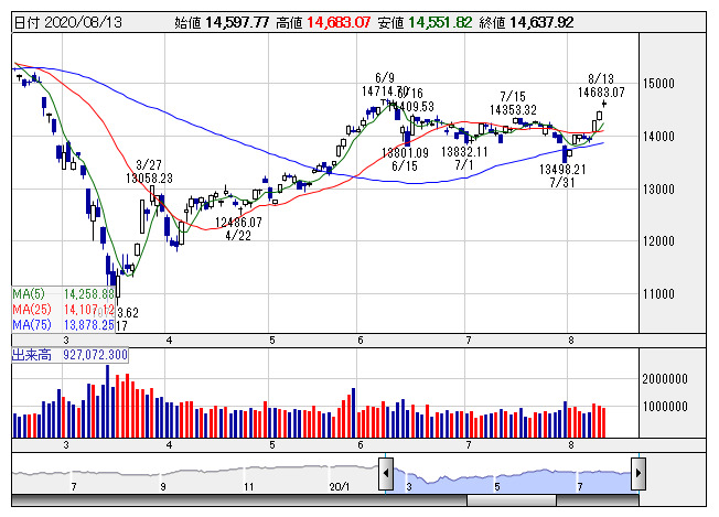 2020年08月14日08時46分 【市況】JPX日経400先物:14日寄り付き=25ポイント高、1万4665ポイント JPX日経400 <日足> 「株探」多機能チャートより 14日8時45分、JPX日経インデックス400先物期近2020年9月限は前日清算値比25ポイント高の1万4665ポイントで寄り付いた。前日のJPX日経インデックス400の現物終値1万4637.92ポイントに対しては27.08ポイント高。夜間取引の終値1万4625ポイントに対しては40ポイント高となっている。 株探ニュース