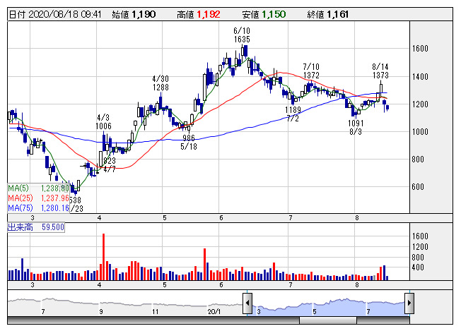 クラウドW <日足> 「株探」多機能チャートより戦略的な広告宣伝費の増加に伴い足もと赤字決算は余儀ない状況にあるものの、20年9月期通期の営業損益は従来予想から上方修正し赤字幅が縮小する見通しで、収益体質も改善傾向にある。株価は8月に入り戻り足を強め、目先大きく利食われたがここはチャンスだ。早晩切り返し6月10日の戻り高値1635円を目指す展開が想定される。(桂)