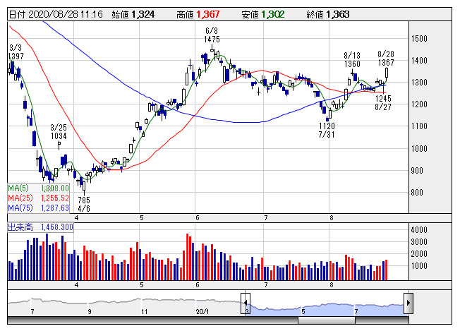 三菱UFJフィナンシャル・グループ<8306>や三井住友フィナンシャルグループ<8316>、みずほフィナンシャルグループ<8411>といったメガバンクが高い。パウエル米連邦準備制度理事会(FRB)議長は、27日の米ジャクソンホール会議の講演で、ゼロ金利政策を長期間にわたり続けるために2%を超えるインフレ期間を容認することを表明した。これを受け、同日の米国市場では10年債利回りは前日比0.061%高い0.756%に上昇し、JPモルガン・チェースやバンク・オブ・アメリカといった銀行株が値を上げた。この流れが東京市場に波及し、三菱UFJなど大手銀行株に買いが流入している。