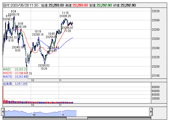 日経平均 <1分足> 「株探」多機能チャートより日経平均株価は堅調に推移。27日の米株式市場では、パウエル米連邦準備制度理事会(FRB)議長の発言を受けNYダウが上昇したほか、為替市場で1ドル=106円80銭前後へ円安が進行したことも買い要因となった。ただ、この日の午後5時から安倍首相が記者会見を予定しており、その内容を確かめたいとの見方から様子見姿勢も強まっている。