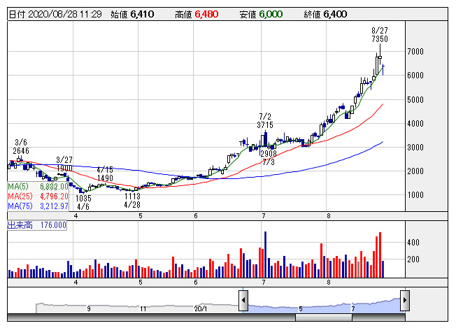 急反発。前日に20年7月期の業績上方修正を発表している。営業利益は従来予想の3.7億円から5.0億円に増額、外出自粛の影響で在宅率が上昇したことから、ECモールでの巣ごもり需要に対応した商品やテレビショッピングでのサプリメントの販売が大きく伸長したもよう。期末配当金も従来予想や前期末の20円から30円に引き上げている。上振れ期待はあったものの、業績・配当金ともに想定以上の引き上げとなる形に。