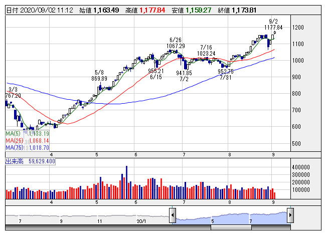 マザーズ指数 <日足> 「株探」多機能チャートより個別ではビープラッツ<4381>がストップ高。リアルワールド<3691>、コラボス<3908>、Sun Asterisk<4053>は一時ストップ高と値を飛ばした。総医研ホールディングス<2385>、ユナイテッド<2497>、SREホールディングス<2980>、cotta<3359>、農業総合研究所<3541>など26銘柄は年初来高値を更新。インターファクトリー<4057>、みらいワークス<6563>、グッドスピード<7676>、ログリー<6579>、バンク・オブ・イノベーション<4393>は値上がり率上位に買われた。