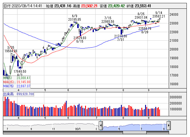 【市況】日経平均14日大引け=3日続伸、152円高の2万3559円