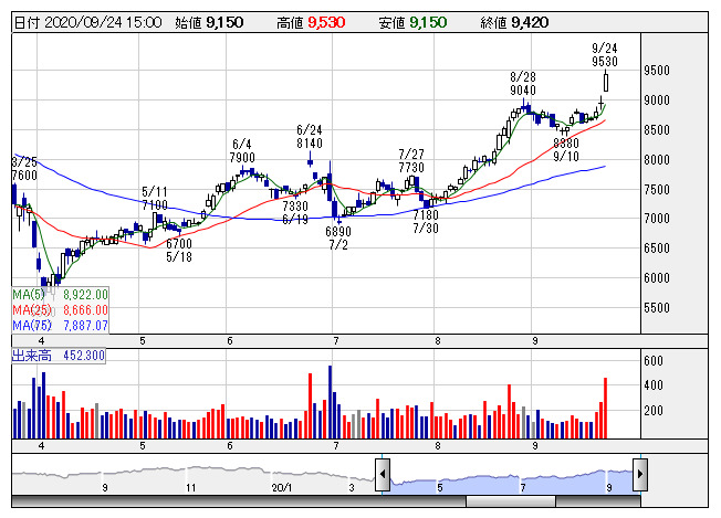 急騰。未定としていた業績予想を前日に公表。上半期営業利益は16億円で前年同期比0.3%減、通期では37億円で前期比43.9%増としている。ビデオゲーム事業が巣ごもり需要により「Nintendo Switch」関連商品を中心に好調に推移しているほか、模型玩具卸売事業への新規参入効果なども寄与している。第1四半期が前年同期比21.7%減と低調スタートだったため、順調な収益回復をプラス視する形に。
