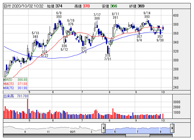 ユニチカ <日足> 「株探」多機能チャートより新型コロナウイルス感染症の感染拡大による影響が年間を通じて発生すると仮定し業績予想を作成したという。売上高は前期比8%減の1100億円と減収を見込むものの、宇治事業所で発生した火災事故にかかる保険金として約30億円を計上することが利益を押し上げる見込みだ。また、未定としていた今期の年間配当は前期に引き続き無配とする方針も明らかにしている。