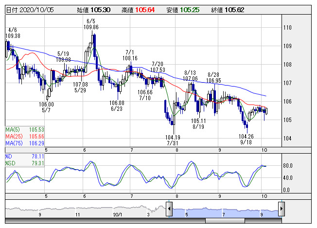 米ドル/円 <日足> Slowストキャス 「株探」多機能チャートより5日のニューヨーク外為市場でドル・円は105円54銭から105円79銭まで上昇して105円75銭で引けた。トランプ大統領が早くて5日中にも退院する可能性が報じられ、政局不安が後退したほか、引き続き追加財政策への期待や9月ISM非製造業景況指数が予想外に上昇したことを背景に米債利回り上昇に伴うドル買い、リスク選好の円売りが優勢となった。