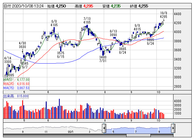 安川電 <日足> 「株探」多機能チャートより10月9日の決算発表銘柄(予定) ★は注目決算