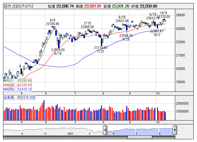 週明け12日は米NYダウが250.62ドル高の28837.52、ナスダック総合指数が296.32pt高の11876.26、シカゴ日経225先物が大阪日中比95円高の23615。本日の日経平均は反発が予想される。昨日は一時5日線割れも23500円台をキープし、終値は5日線上へ復帰。25日線の上昇継続を底流とした短期的なスピード調整完了を示唆した。このため本日はリバウンド態勢が予想されるが、一目均衡表は基準線と転換線が横ばいのため方向感が出にくく、ボリンジャーバンドで+1σ相当の値幅が小さいこともあり、上値と下値ともに限られよう。