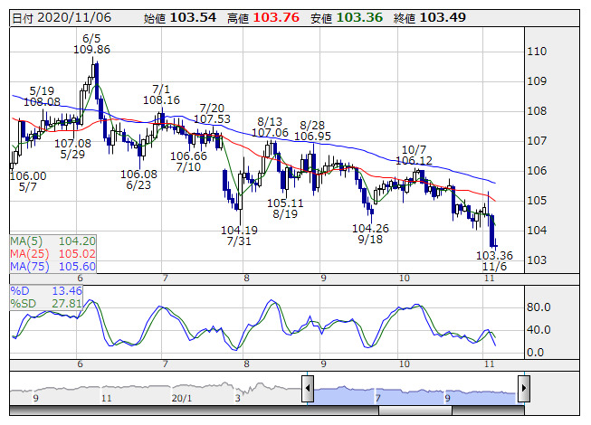 2020年11月06日18時01分 【通貨】外為:1ドル103円48銭前後と小幅なドル高・円安で推移 米ドル/円 <日足> Slowストキャス 「株探」多機能チャートより 6日の外国為替市場のドル円相場は午後6時時点で1ドル=103円48銭前後と、午後5時時点に比べ7銭の小幅なドル高・円安。ユーロ円は1ユーロ=122円50銭前後と10銭のユーロ高・円安で推移している。 株探ニュース