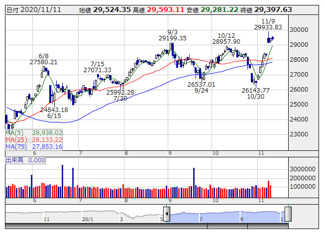 NYダウ <日足> 「株探」多機能チャートより11日の米株式市場では、NYダウ平均株価が前営業日比23ドル29セント安の2万9397ドル63セントと3日ぶり反落。ナスダック総合株価指数は同232.575ポイント高の1万1786.431だった。