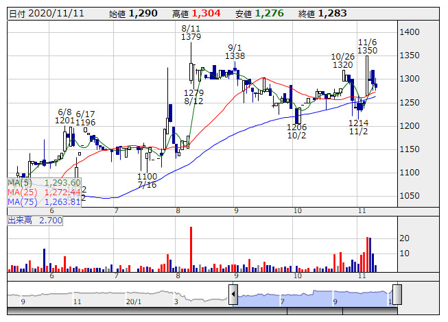 本州化 <日足> 「株探」多機能チャートより(東証上場 3982 銘柄対象[ETF、REIT含む])