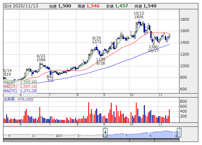 オークファン <日足> 「株探」多機能チャートより13日引け後に、株主優待制度について新設や拡充、変更、廃止を発表した銘柄を取り上げた。
