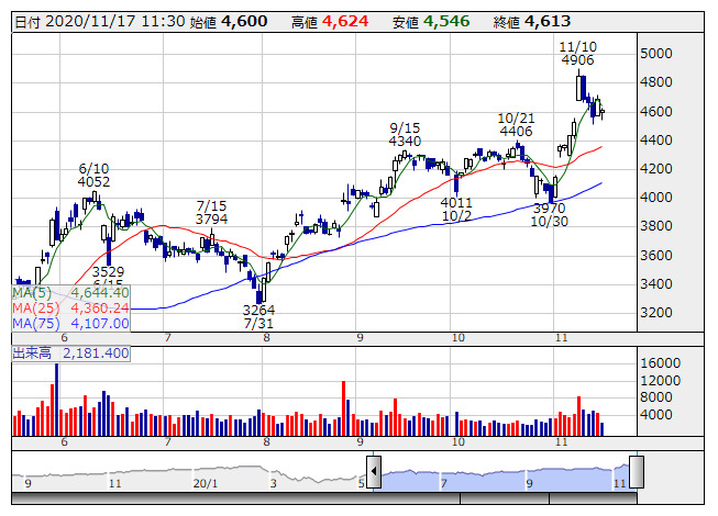 大幅続伸。米モデルナがコロナワクチンの最終治験において、94.5%の有効性を得られたと発表している。先に発表したファイザーに続く好内容となっており、世界的な景気の正常化につながっていくとの期待感が高まっている。とりわけ、海外との往来活発化による航空需要の回復を織り込む動きから、空運株の強い動きが目立っている。なお、同社とANNAHDに対しては、ゴールドマン・サックス証券による投資判断格上げの動きも観測されている。