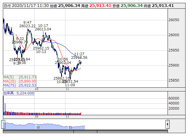 日経平均 <1分足> 「株探」多機能チャートより日経平均 : 25913.41 (+6.48)