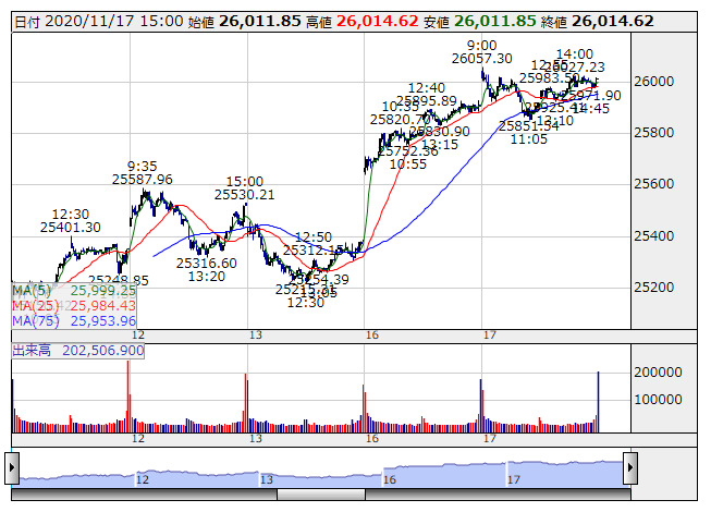 2020年11月18日09時08分 【市況】日経平均の下げ幅が200円を超える 日経平均 <5分足> 「株探」多機能チャートより 日経平均株価の下げ幅が200円を超えた。9時8分現在、210.02円安の2万5804.6円まで下落している。 株探ニュース