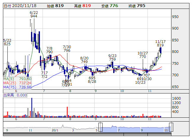 イナリサーチ <日足> 「株探」多機能チャートより18日前場 ストップ高: 4銘柄 ストップ安: 1銘柄 (気配、一時を含む)