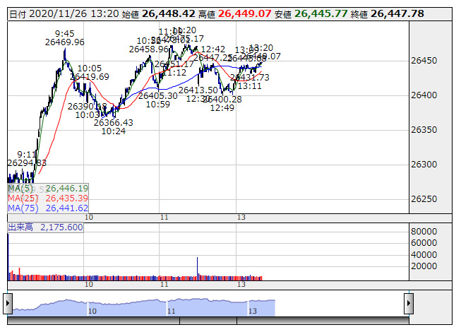 日経平均 <1分足> 「株探」多機能チャートより26日の後場の取引では以下の3つのポイントに注目したい。