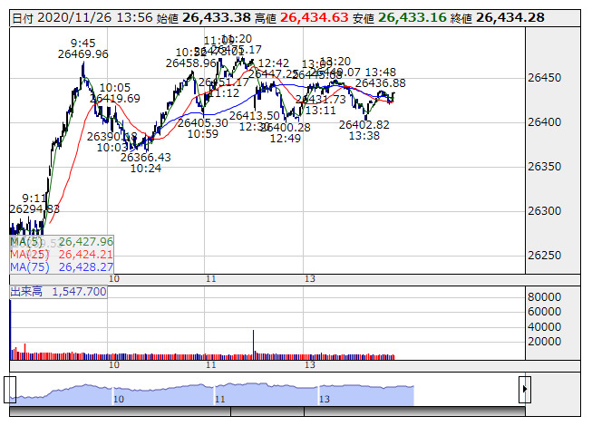 2020年11月26日14時16分 【市況】日経平均の上げ幅が200円突破 日経平均 <1分足> 「株探」多機能チャートより 日経平均株価の上げ幅が200円を突破。14時16分現在、206.03円高の2万6502.89円まで上昇している。 株探ニュース
