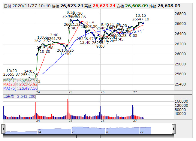 【市況】11時の日経平均は15円安の2万6522円、ファストリが20.55円押し下げ