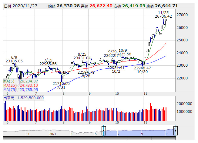 2020年11月30日06時55分 【市況】シカゴ日経平均先物 大取終値比 145円高 (11月27日) 日経平均 <日足> 「株探」多機能チャートよりシカゴ日経225先物12月限 (円建て) 26775 ( +145 ) シカゴ日経225先物12月限 (ドル建て) 26785 ( +155 ) ※( )は大阪取引所終値比 株探ニュース