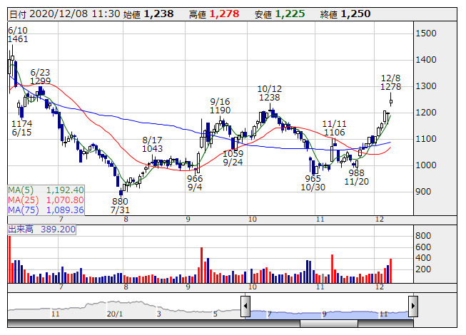大幅反発。前日に発表した自社株買いの取得実施が好感材料視される。発行済み株式数の3.42%に当たる200万株、20億円を取得上限としており、取得期間は12月8日から21年1月29日まで。比較的短期間での高水準の取得枠となっており、需給インパクトなどを期待する動きが優勢に。同社の自社株買いは、19年2月12日から2月25日にかけて100万株を取得して以降となる。