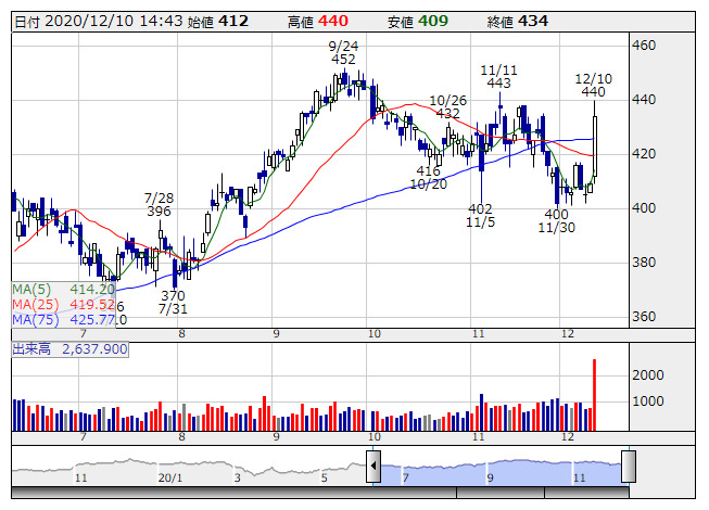 インティメート・マージャー<7072>=一時ストップ高。同社はネットを通じて消費者データを収集し、マーケティング支援などに活用する事業を展開している。9日取引終了後、新たなサービスとしてサードパーティー・クッキーを利用せずに、異なるドメイン間でサードパーティー・データを連携する共通IDソリューション「IM Universal Identifier(IM-UID)」の提供、および各プラットフォームとの連携を開始することを発表した。これによる収益への貢献を期待した買いが集中する格好となった。株価は11月16日にマドを開けて急落して以降、下値模索を続けていたこともあって値ごろ感が生じており、追随買いを誘っている。