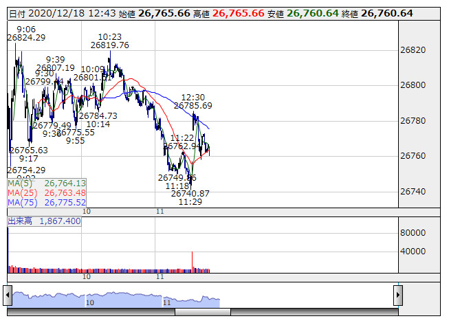 日経平均は3日ぶり小幅反落。49.78円安の26756.89円(出来高概算4億9000万株)で前場の取引を終えている。