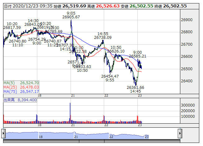 2020年12月23日09時57分 【市況】日経平均がマイナス転換 日経平均 <5分足> 「株探」多機能チャートより 日経平均株価がマイナス転換。9時57分現在、4.75円安の2万6431.64円まで下落している。 株探ニュース