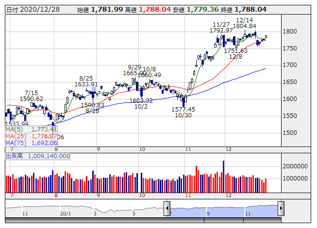 TOPIX <日足> 「株探」多機能チャートより日本取引所が公表した先物手口情報によると、12月28日のTOPIX先物期近(2021年3月限)の夜間取引(立会内・J-NETの合算)で、買い越しトップはUBS証券の45枚、売り越しトップはSMBC日興証券の21枚だった。