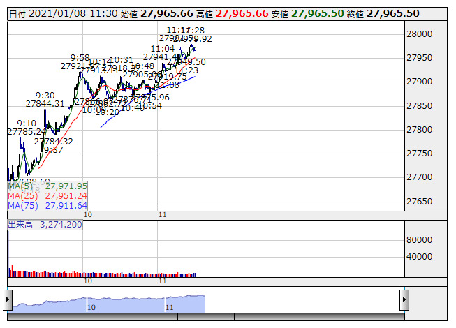 日経平均は大幅続伸。475.37円高の27965.50円(出来高概算6億5000万株)で前場の取引を終えている。