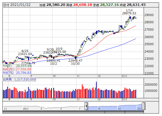 日経平均 <日足> 「株探」多機能チャートより[本日の想定レンジ]先週末22日は米NYダウが179.03ドル安の30996.98、ナスダック総合指数が12.15pt高の13543.06、シカゴ日経225先物が大阪日中比20円安の。本日の日経平均は堅調が予想される。先週末はローソク足が陽線で終了。終値は上向きの5日線上をキープしたほか、25日線や26週線なども上向きで週末を迎え、上昇トレンド継続を示唆。一目均衡表では日足でも週足でも3役好転下の買い手優位が続き、ともに転換線が上向いて短期的な上昇圧力を窺わせている。ただ、14日高値28979.53円が抵抗線となって目先の上値は限られそうだ。5日線が先週末終値直下を走っており、終値が5日線を下回ると大勢強気の中で28500円処でのもみ合いが長期化するリスクが増してくる点にも留意したい
