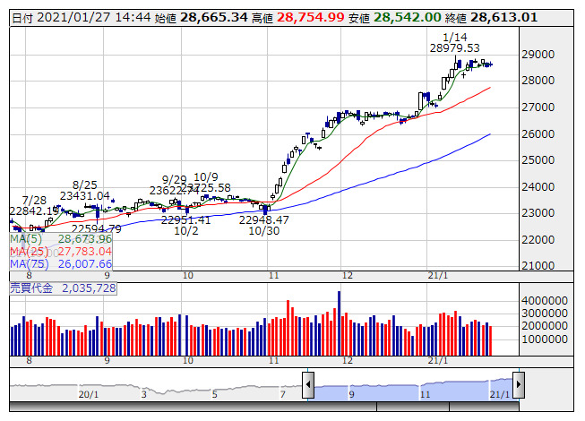 日経平均 <日足> 売買代金 「株探」多機能チャートより個別ではNEXTNASDAQ-100 <1545> 、上場インデックスNASDAQ100為替ヘッジなし <2568> 、トップシェアインデックス(ネットリターン)ETN <2072> が新高値。