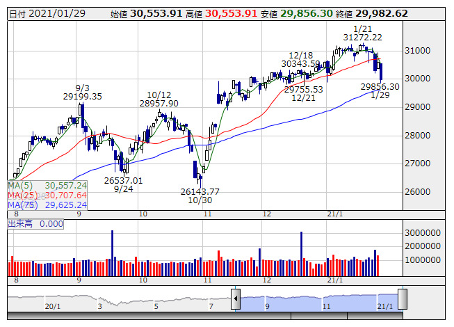 NYダウ <日足> 「株探」多機能チャートより米新興証券のロビンフッドは28日に、個人投資家の投機的取引で株価が急騰しているゲームストップなど一部銘柄の購入を制限したが、批判が殺到するなか29日から取引を再開した。これを受け、ゲームストップやAMCエンターテインメントといった銘柄が急騰。これら銘柄に空売りを仕掛けていたファンドが損害を受け市場が混乱することを警戒する売りが膨らんだ。NYダウは昨年12月14日以来の3万ドル割れとなった。アップルやアマゾン・ドット・コム、マイクロソフトが安く、エヌビディアやアドバンスド・マイクロデバイシズが下落。JPモルガン・チェースやバンク・オブ・アメリカが値を下げた。ボーイングやアメリカン航空グループが売られた。半面、モデルナやノババックスが急伸し、ファイザーが値を上げた。スカイワークス・ソリューションズやクアルコム、バイオジェンが買われた。