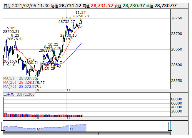 4日の米株式市場でNYダウは4日続伸し、332ドル高となった。週間の新規失業保険申請件数が予想外に減少したことが好感されたほか、下院が2021会計年度の予算議案を可決し、追加経済対策の実現期待も高まった。ハイテク株比率の高いナスダック総合指数は1.2%の上昇となり、過去最高値を更新。本日の日経平均もこうした流れを引き継いで289円高からスタートすると、朝方伸び悩む場面もあったが、香港などアジア市場がおおむね好調な出足だったことから上げ幅を広げ、前引けにかけて一時28750.28円(408.33円高)まで上昇した。